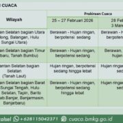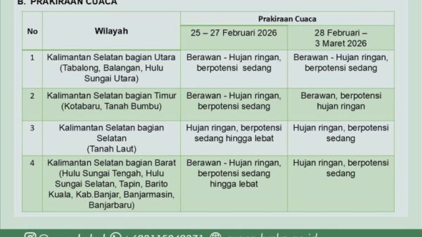 KALSEL, REPORTASE9.ID – Kepala BMKG Stasiun Meteorologi Syamsudin Noor, Ota Welly Jenny Thalo melalui prakirawan Ruth Mandasari S. sampaikan prospek cuaca mingguan wilayah ...
