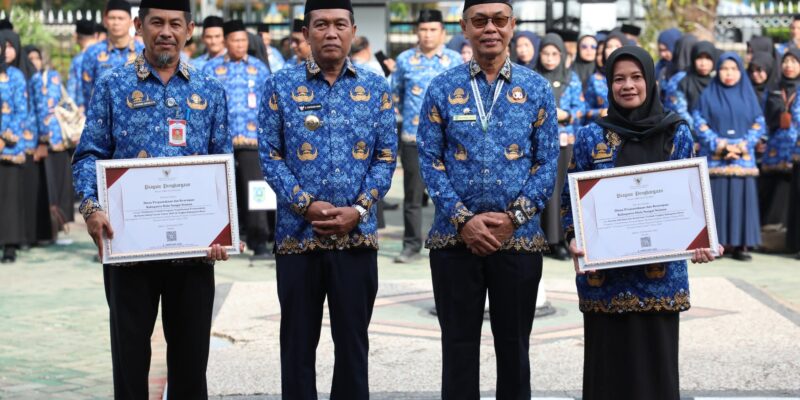 Bupati HSS didampingi Sekretaris Daerah menyerahkan piagam penghargaan kepada para pemenang Lomba ASN BerAKHLAK, serta piagam penghargaan dari Perpustakaan Nasional Republik Indonesia kepada Kepala Dinas Perpustakaan dan Kearsipan Kabupaten HSS atas capaian sebagai pelaksana terbaik Program Transformasi Perpustakaan Berbasis Inklusi Sosial Tahun 2025 tingkat kabupaten/kota.
