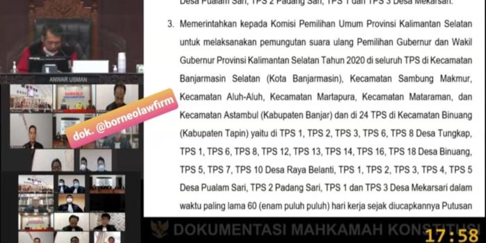 Hasil putusan Sidang Mahkamah Konstitusi RI yang menyatakan rekapitulasi hasil pemungutan suara pemilihan Gubernur dan Wakil Gubernur Kalimantan Selatan, agar di lakukan PSU tentu saja, harus dilaksanakan oleh pihak KPU RI dan Bawaslu RI agar segera menginstruksikan kepada KPU Provinsi Kalsel dan KPU daerah Kabupaten/Kota yang tergugat karena hasil pilkada yang dianggap tidak sah dan terjadinya pelanggaran-pelanggaran yang sudah dibuktikan dalam persidangan MK RI.