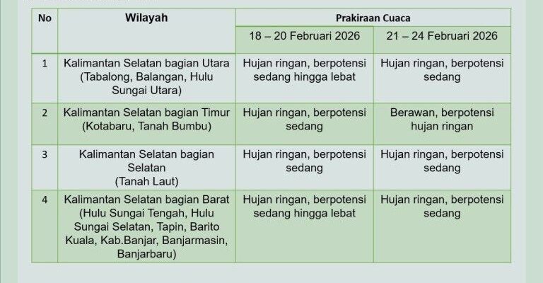 KALSEL, REPORTASE9.ID – Kepala BMKG Stasiun Meteorologi Syamsudin Noor, Ota Welly Jenny Thalo melalui prakirawati Bayu Kencana Putra sampaikan prospek cuaca mingguan wilayah Kalimantan Selatan (Kalsel) yang berlaku 18–24 Februari 2026 (update 17 Februari 2026) pada Rabu (18/2/2026),