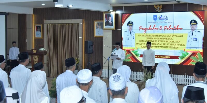 HSS, REPORTASE9.ID – Bupati Hulu Sungai Selatan (HSS), Syafrudin Noor kukuhkan dan melantik Tim Pakar Pendampingan dan Evaluasi Pembangunan Daerah, Ketua dan Wakil Ketua Badan Amil Zakat Nasional (BAZNAS), serta Anggota Unit Pemantau Pelayanan Publik (UPPP) Kabupaten HSS pada Kamis (26/2/2026).