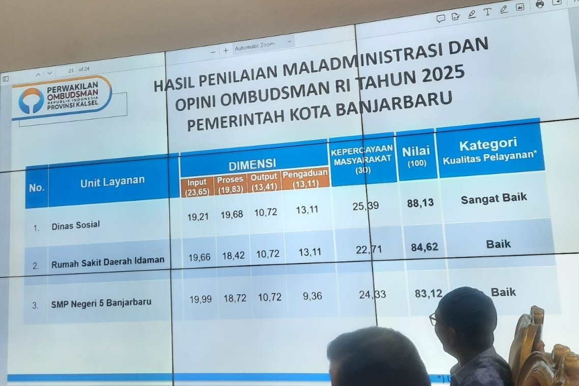 Dalam penilaian tahun 2025 tersebut, terdapat tiga Organisasi Perangkat Daerah (OPD) di lingkungan Pemerintah Kota Banjarbaru yang masuk evaluasi Ombudsman. Dinsos mencatatkan nilai 88,13, disusul Rumah Sakit Daerah Idaman (RSDI) dengan nilai 84,62, serta SMPN 5 Banjarbaru dengan nilai 83,12.