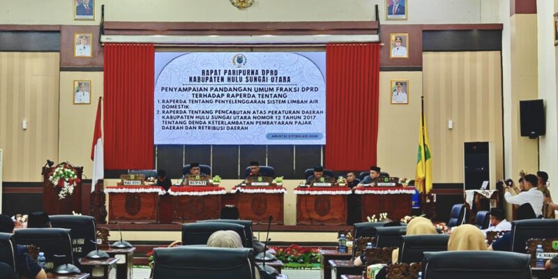 Rapat Paripurna ke-3 Masa Sidang I Tahun 2026 tersebut membahas Raperda tentang Penyelenggaraan Sistem Limbah Air Domestik dan Raperda tentang Pencabutan Atas Peraturan Daerah Kabupaten HSU Nomor 12 Tahun 2017 tentang Denda Keterlambatan Pembayaran Pajak Daerah dan Retribusi Daerah.