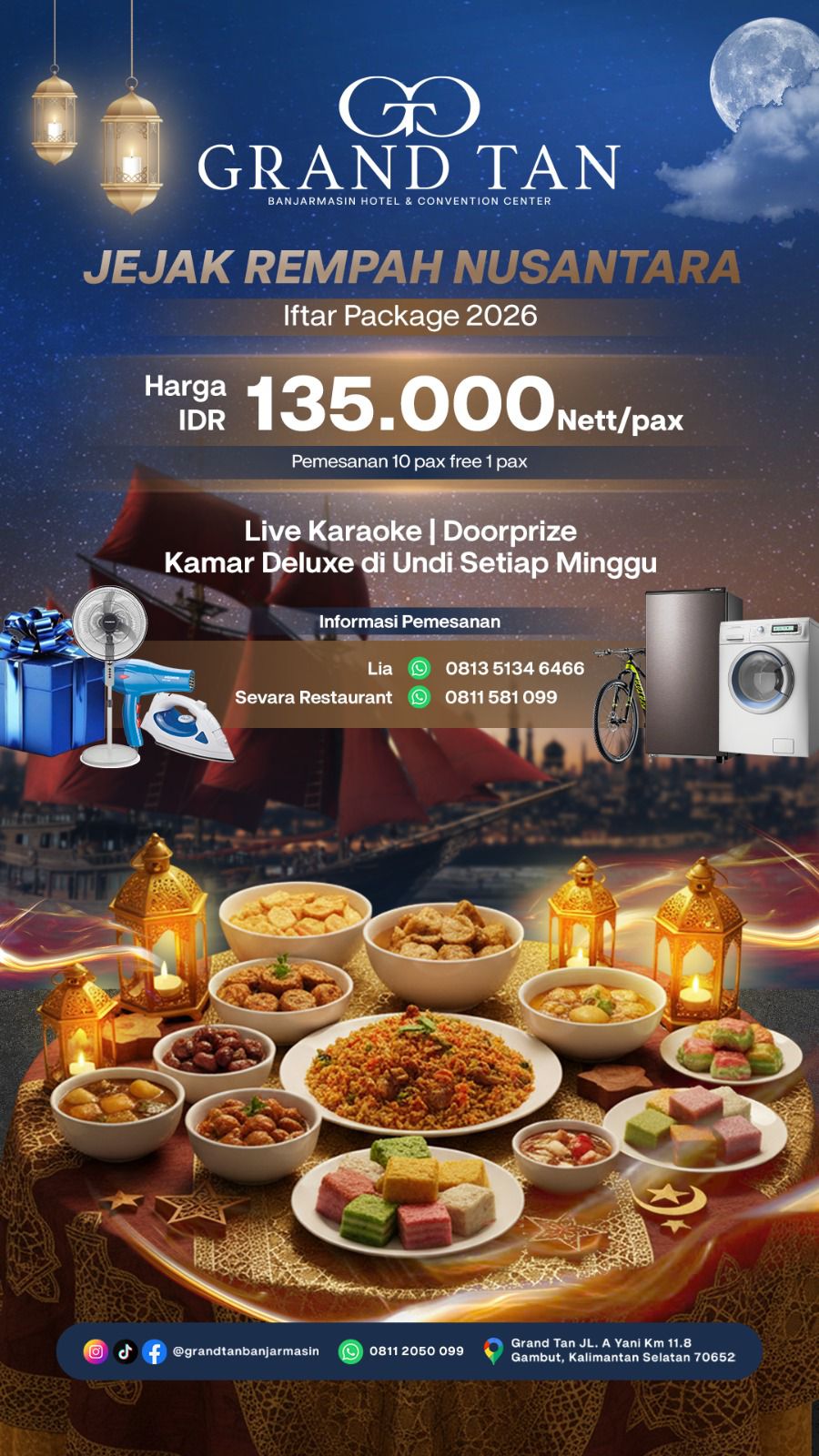 Untuk reservasi, masyarakat dapat menghubungi Sevara Restaurant di 0811 5810 99. Nikmati berkah Ramadan dan pengalaman berbuka istimewa di Grand Tan Banjarmasin.