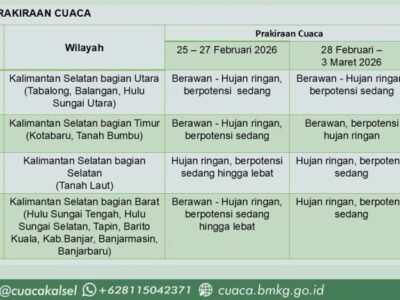 KALSEL, REPORTASE9.ID – BMKG Stasiun Meteorologi Syamsudin Noor kembali merilis prospek cuaca mingguan wilayah Kalimantan Selatan (Kalsel) yang berlaku pada 18–24 Maret 2026, ...
