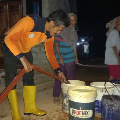 Menggunakan armada truk tangki berkapasitas 5.000 liter, tim BPBD suplai air bersih ke Desa Pingaran Ulu RT 09 Kecamatan Astambul, Minggu (8/10/2023) malam. Suplai air dilakukan di empat titik, baik pada tandon pinjam pakai milik BPBD dan pada tempat tampung air warga yang antre untuk mendapatkan air bersih.