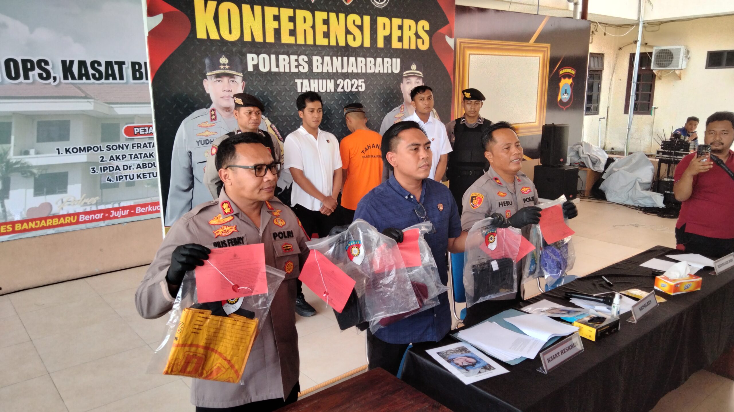Kapolres Banjarbaru AKBP Pius X Febri Aceng Loda, Kasat Reskrim dan Kapolsek Banjarbaru Utara saat tunjukkan barang bukti (Foto : Azmi/R9)