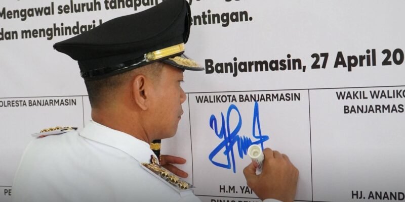 BANJARMASIN, REPORTASE9.ID – Wali Kota Banjarmasin M. Yamin HR bersama unsur Forum Koordinasi Pimpinan Daerah (Forkopimda) Kota Banjarmasin laksanakan penandatanganan Komitmen Bersama dalam penyelenggaraan Sistem Penerimaan Murid Baru (SPMB) Jenjang TK Negeri, SD Negeri, dan SMP Negeri Kota Banjarmasin Tahun Ajaran 2026/2027 pada Senin (27/4/2026).